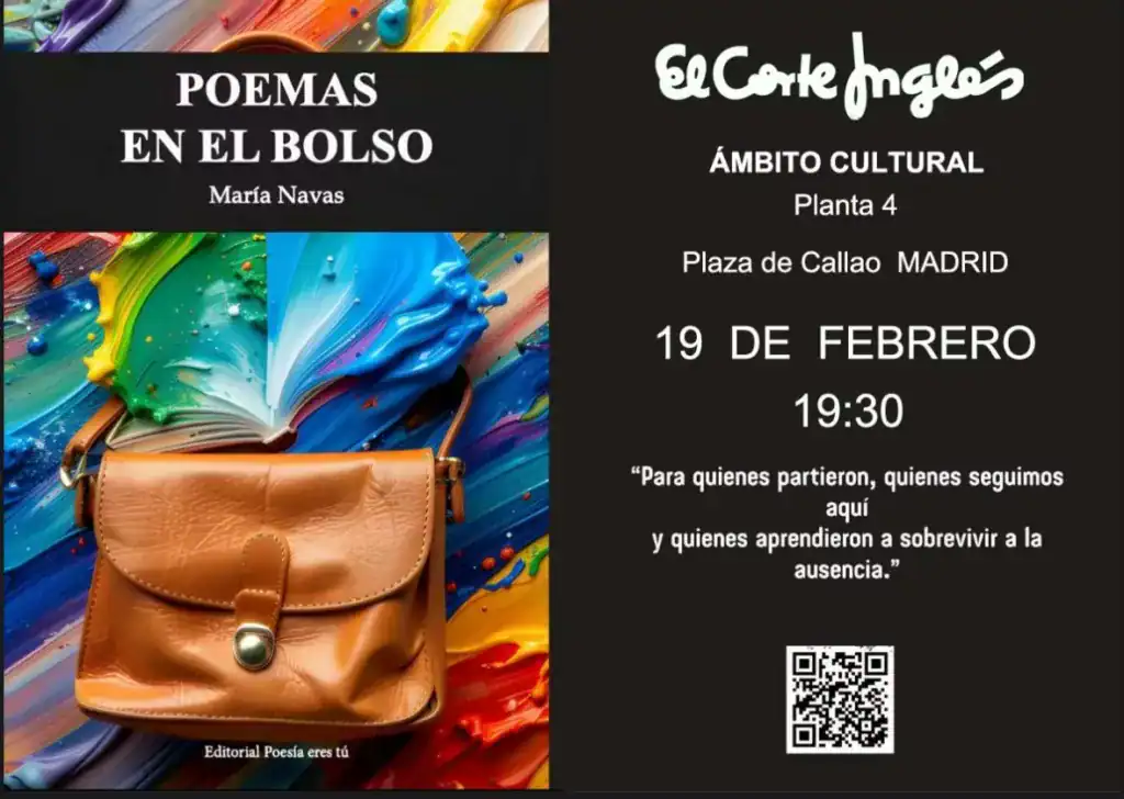 Presentación de Poemas en el bolso. 19 de febrero, a las 19:30 h, el Ámbito Cultural de El Corte Inglés de Callao.23 23Europe/Madrid January 23Europe/Madrid 2026
