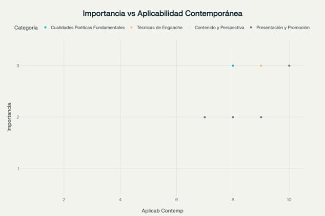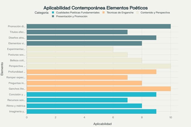 La distribución equilibrada entre las cuatro categorías principales demuestra que el éxito poético contemporáneo requiere atención integral a todos los aspectos del proceso creativo. Desde las cualidades técnicas fundamentales hasta las estrategias de promoción, cada elemento contribuye a la efectividad general del proyecto poético [5][38].