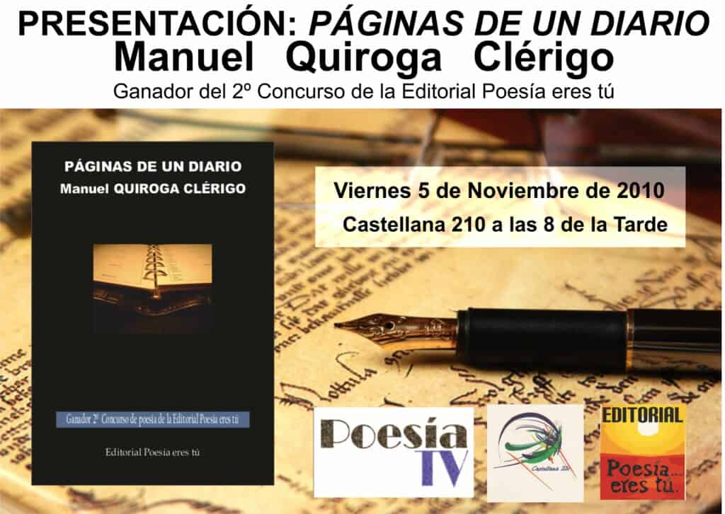 Manuel QUIROGA CLÉRIGO es el ganador del segundo concurso que organiza la Editorial Poesía eres tú por su libro Páginas de un diario, premio que en si primera edición recibió Salustiano MASÓ (poeta de la generación del cincuenta) por su libro Metafísica Recreativa. Manuel Quiroga cuenta con una larga trayectoria de creación con más de 15 libros publicados de poesía y ha recibido numerosos galardones y premios.
