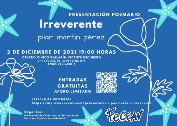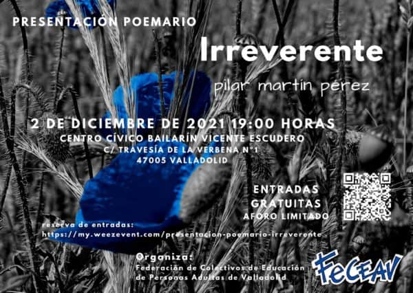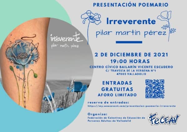 Irreverte presentación de poesía y recital de Pilar Martín Pérez en Valladolid. Entrada gratuita, capacidad limitada, reserva en línea. Poesía eres tú, revista poética y cultural de Valladolid con poesía y arte contemporáneo en línea con keywords.